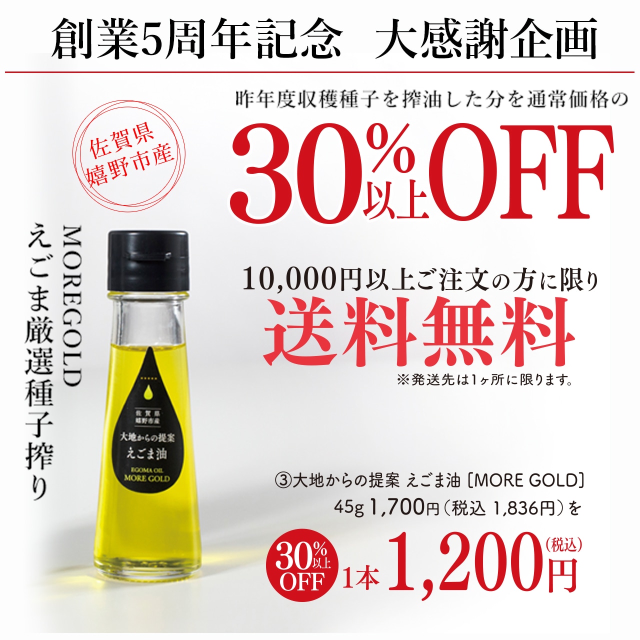 創業5周年記念 大感謝企画 佐賀県嬉野市産 大地からの提案 えごま油【MOREGOLD】45g