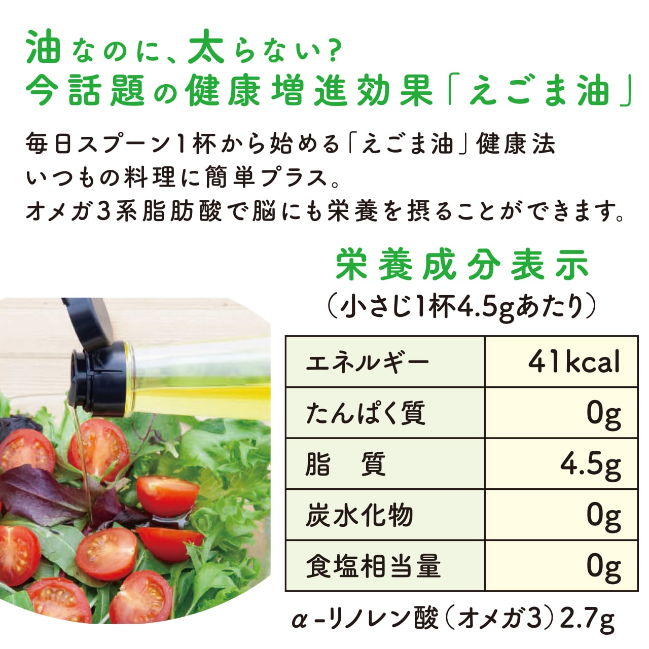 本商品は、健康とおいしさを兼ね備えたえごま油です。毎日の食事に取り入れて、心身ともにリフレッシュしましょう!