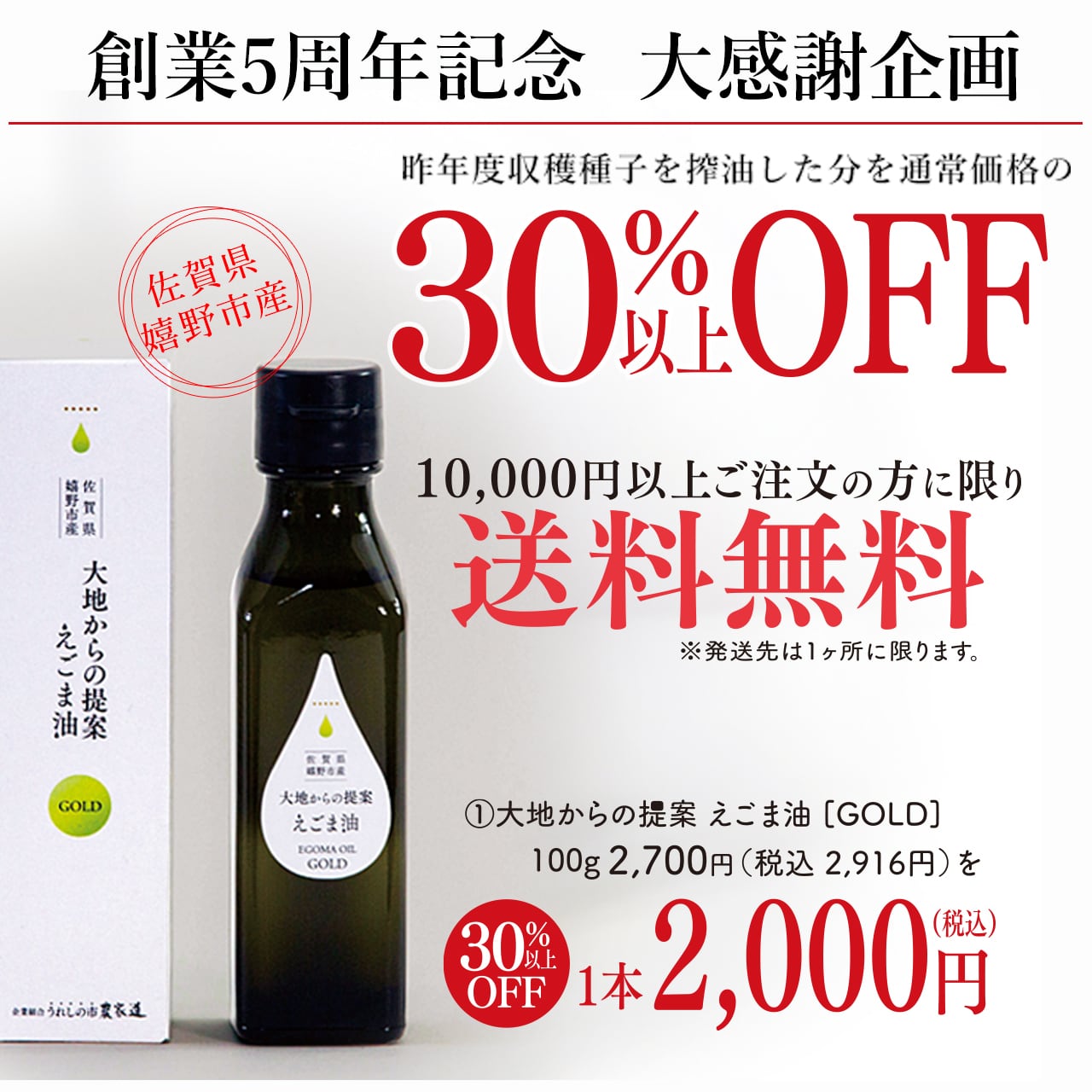 創業5周年記念 大感謝企画 佐賀県嬉野市産 大地からの提案 えごま油【GOLD】100g